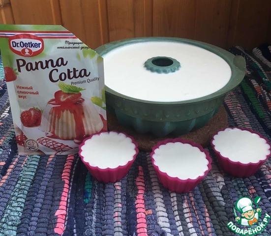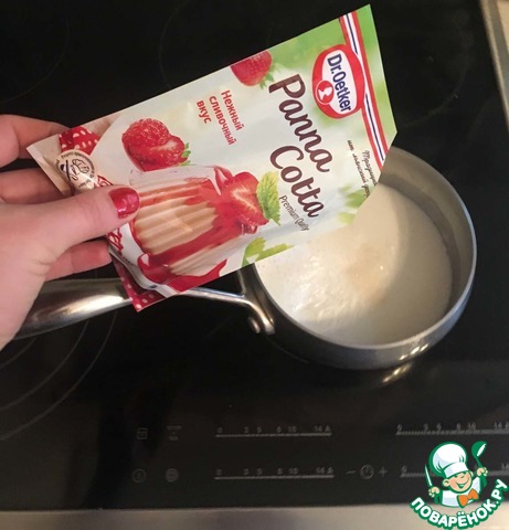 Если вы, как я, используете смесь для панна котты от Dr. Oetker, то действуем по инструкции на упаковке: разогреваем молоко до кипения, добавляем смесь, постоянно помешивая, и варим ещё пару минут на медленном огне, не прекращая мешать.