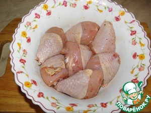 части курицы натереть солью и приправами, сбрызнуть соевым соусом и оставить минимум минут на 40 постоять) -