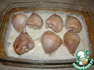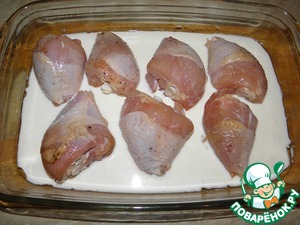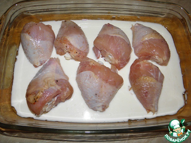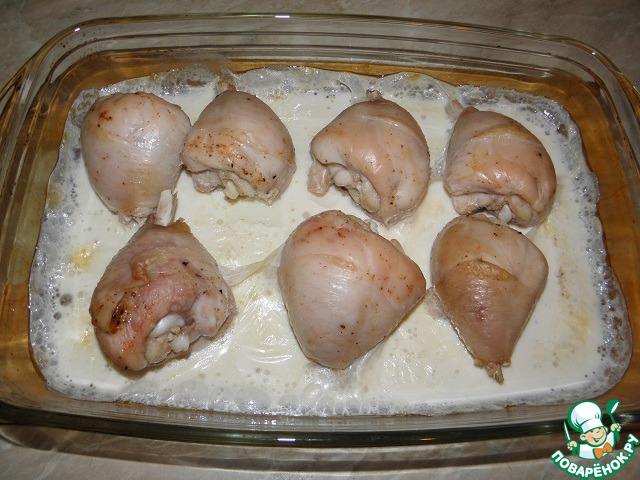 Выложить куски курицы на противень (или в форму) залить молоком