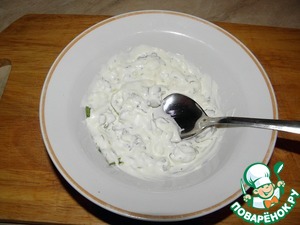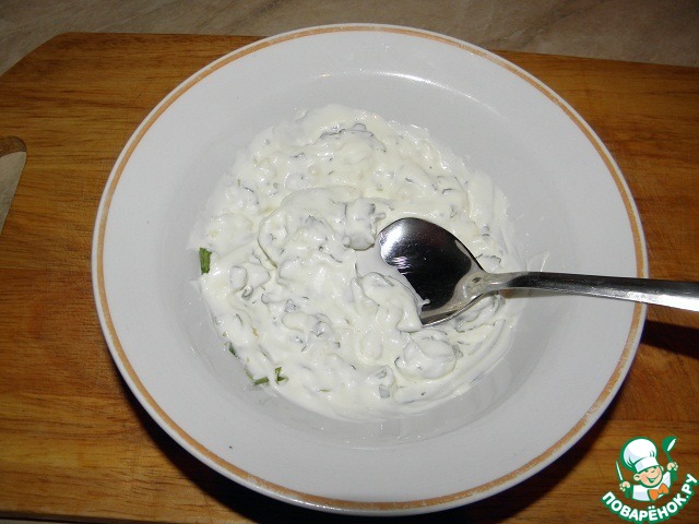 Зелень и чеснок измельчить, добавить майонез