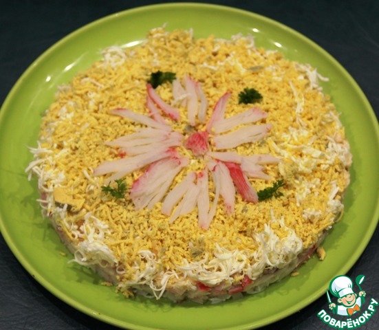 Далее идет слой мелко нарезанных крабовых палочек (тоже промазываем)