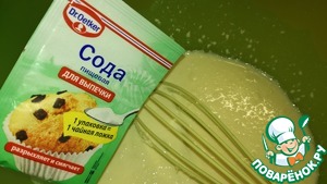 Добавляем гашеную соду (лимонным соком или уксусом). Я использовала сода пищевая для выпечки ТМ "Dr.Oetker". И перемешиваем.