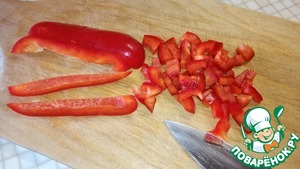 Лук чистим, моем и режем небольшими кубиками, также режем болгарский перец.