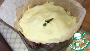 Раскатать круг и накрыть наш кулич, защипать края. Сделать надрез или дырочку по середине.