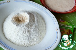 забродившую опару, сухую мучную смесь и замесить тесто.