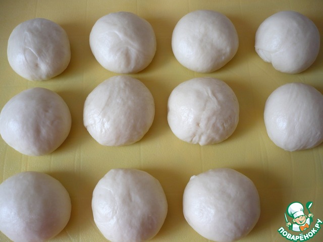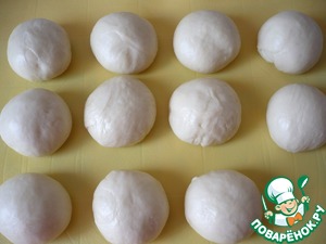Делим тесто на 11 частей и подкатываем каждую часть в шарик, прикрываем пленкой и оставляем минут на 10.