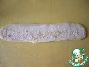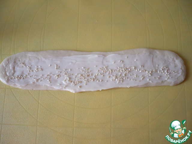 Раскатанную лепешку немного смазать плавленым сыром и посыпать кунжутом или маком.
