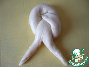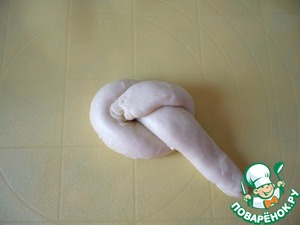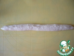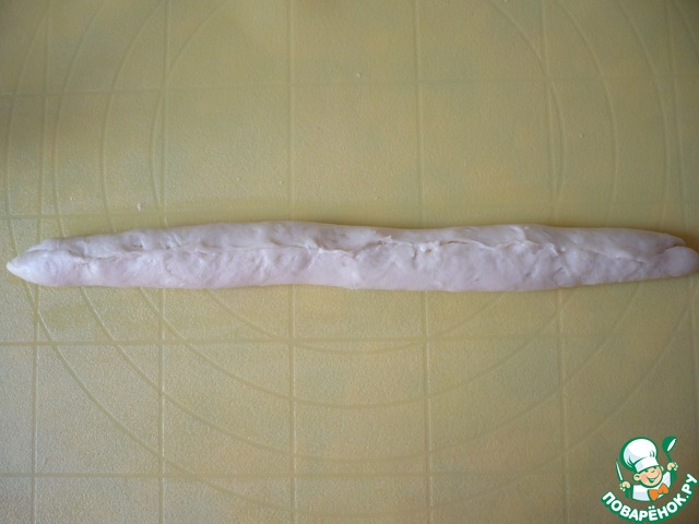 Затем скрутить рулетиком. Края прочно защипнуть. Раскатать жгутик длиной ~25 см.