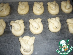 Затем "кроликов" смазываем яйцом и отправляем в духовку при температуре 180 градусов на 20 минут.
