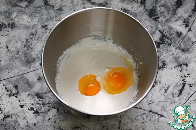 К творогу добавить сметану, соль, сахар. Перемешать миксером или ручным венчиком. -