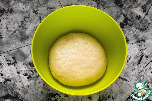 Замесить гладкое тесто, не липнущее к рукам. Тесто округлить и положить в миску, смазанную растительным маслом. Миску накрыть и оставить тесто "отдохнуть" минут на 15-20.
