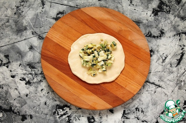 Шарик теста раскатать в не тонкую лепешку. На центр лепешки положить 1-1,5 ст. л. начинки. -