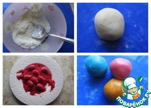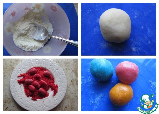 Для приготовления сладких яиц смешать сахарно пудру, детскую молочную смесь в соотношении 1:1. Порциями по 1 чайной ложке добавлять сгущенное молоко хорошего качества до получения нужной консистенции. Смесь можно подкрасить, используя красители. Из смеси сформировать сладкие яйца нужного Вам размера. В моем случае сладкие яйца обвалены в окрашенной бисквитной крошке.
