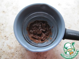 Шоколад поломать на мелкие кусочки. В ковшике нагреть воду да 80-90 градусов, поставить туда посуду с шоколадом, периодически помешивать до полного растворения шоколада.
