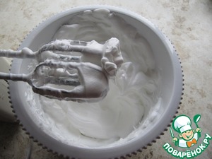 Яйца разделить на белки и желтки. Белки взбить без сахара до мягких пик, затем в несколько приемов ввести 50 г сахара и взбить до устойчивых пик. Отставить в сторону.