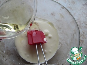 К желткам добавить щепотку соли и 10 г сахара, взбить в светлую и пышную массу. В несколько приемов влить растительное масло, взбить миксером.