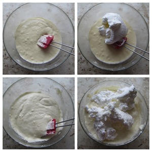 В несколько приемов подмешать взбитые белки желтково-мучной смеси методом "сверху-вниз", "от краев-к центру".