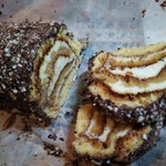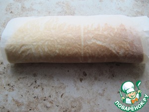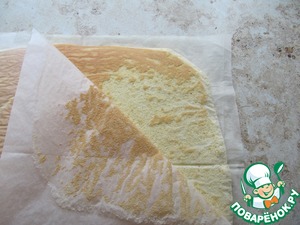 Положить бумагу для выпечки чистой стороной к бисквиту, свернуть в не тугой рулон, полностью охладить.