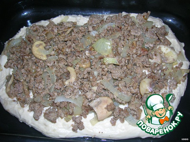 Подошедшее тесто делим на 2 части. Оно получается жидковатым, не страшно. Берeм форму, смазываем растительным маслом, половину теста равномерно руками распределяем по форме. Сверху раскладываем фарш.