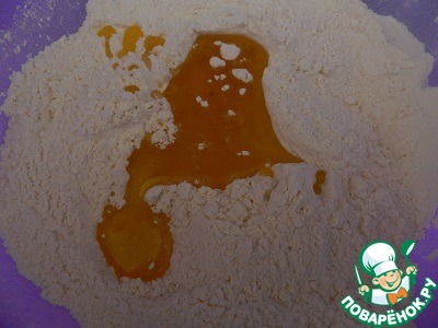 В миску насыпать 250г муки, добавить 1/2ч. л. соли и 1ч. л. разрыхлителя, перемешать. Влить оливковое масло и, по немногу добавляя горячую (не кипяток) воду, замесить тесто сначала ложкой, затем вымесить вручную.