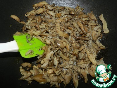 Пока приготовим начинку. Грибы порезать любым удобным для вас способом, я порезала соломкой. И отправить на разогретую сковороду обжариваться (масло я не добавляла). Обжаривать грибы под крышкой на среднем огне до полного испарения жидкости. В конце посолить, добавить свежемолотый перец.