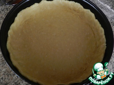 Тесто достать из холодильника. Раскатать его в пласт, больший по деаметру формы для выпечки (разъемная 26см), и перенести в смазанную маслом форму. Сформировать бортики будущего пирога. Тесто очень эластичное, абсолютно легко переносить его в форму.