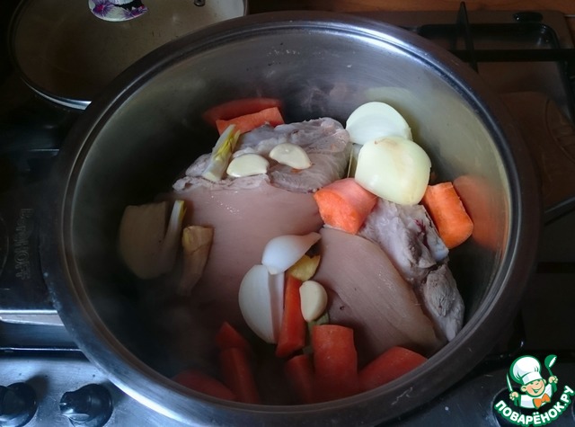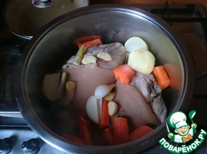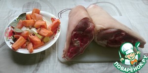 Рульки моем. Морковь, лук, имбирь режем на небольшие куски, чеснок раздавливаем ножом. -