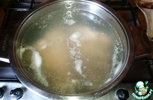 В кастрюлю с кипящей водой кладем рульку, доводим до кипения и варим минут 15. На пену не обращаем внимания.