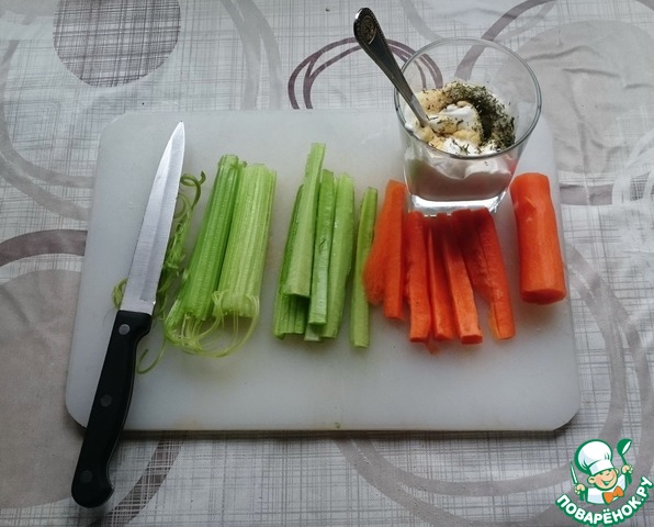 Моем пару черешков сельдерея, зачищаем их от жестких прожилок. Чистим морковь. Нарезаем сельдерей и морковь на небольшие брусочки.