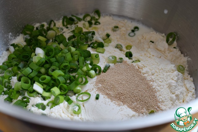 В теплое молоко вбить яйцо (С0), всыпать сахарную пудру, ванилин (я использую сахарную пудру со вкусом ванили Dr.Oetker), соль, дрожжи и просеянную муку. Добавить мелко нарезанный зеленый лук и вымесить тесто до однородности.