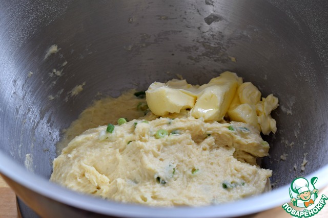 В последнюю очередь добавить в тесто размягченное сливочное масло и месить тесто минут 7-10.