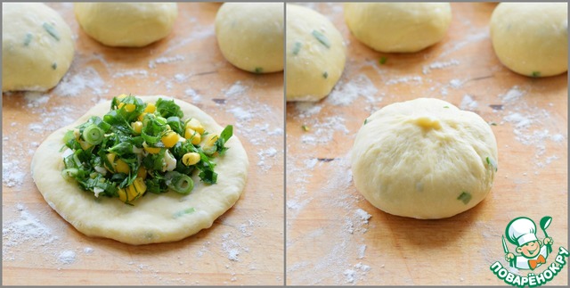 В середину лепешки выложить начинку (начинки не жалеем!), слепить края теста, сформировав круглый пирожок. -