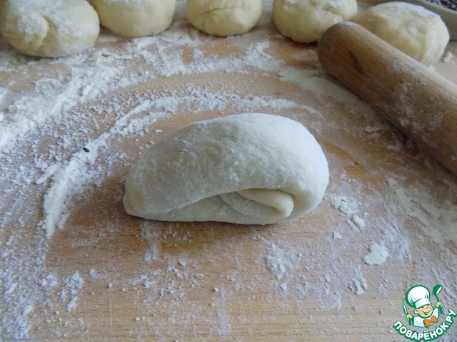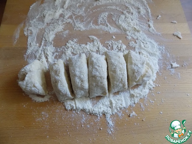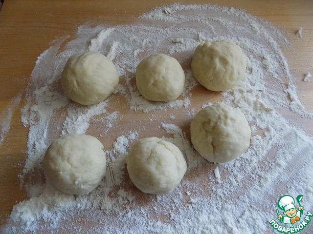 Из теста скатать "колбаску" и разрезать её на равные части, визуально разделив её на количество будущих плюшек. Из количества ингредиентов, которые я дала для теста у меня получилось 6 кусков для будущих плюшек.