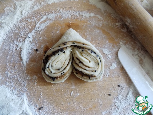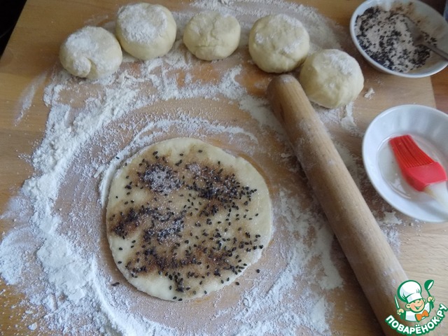 Раскатываем каждый шарик в лепёшку D~15 см, толщиной-0,5-0,7см. Смазываем кисточкой с подсолнечным маслом по всей плоскости и посыпаем сахаром с кунжутом (маком) и корицей. Примерно на 1 плюшку 1-1,5 ч л.