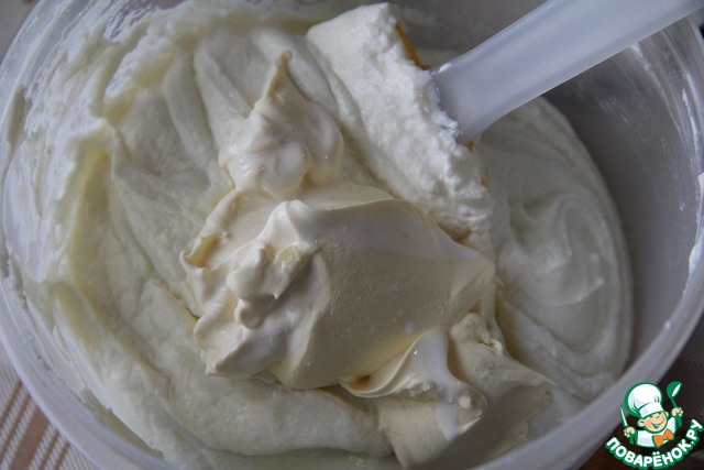 Добавить сахар, лимонный сок и перемешать. Затем - сметану и сливки. Еще раз все хорошо взбить.