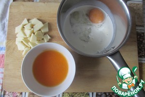 В маленькой кастрюльке смешиваем желток, ванильный сахар и 50 мл сливок. Остальные сливки убираем на время в холодильник. -