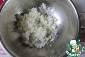 Творог разминаем. Если в твороге ощутимы крупинки, протираем его сквозь сито.