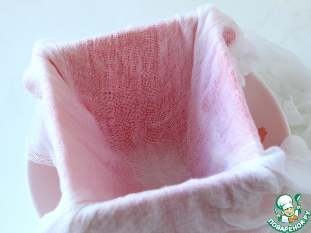 Марлю ошпарьте кипятком, отожмите, хорошенько отряхните и застелите ею форму для пасхи. -