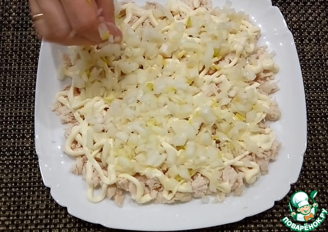 На большую тарелку первым слоем выложите курицу, затем майонез. Я отрезаю уголок пакета с майонеза и рисую сеточку.