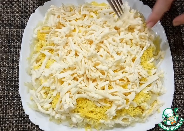 Затем на мелкой терке натрите яичный желток и хорошенько распределите с помощью вилкой по всей поверхности салата.