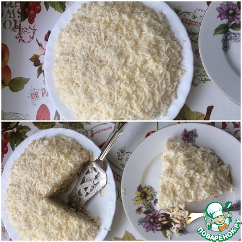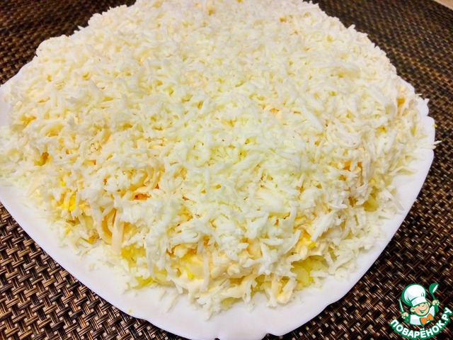 И последний слой – это яичный белок. Натрите его на мелкой терке и вилочкой распределите по всему салатику.