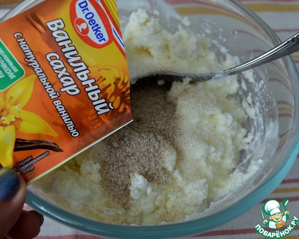 Смешать творог со сметаной (80 г.), сахаром и ванильным сахаром. -