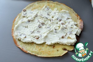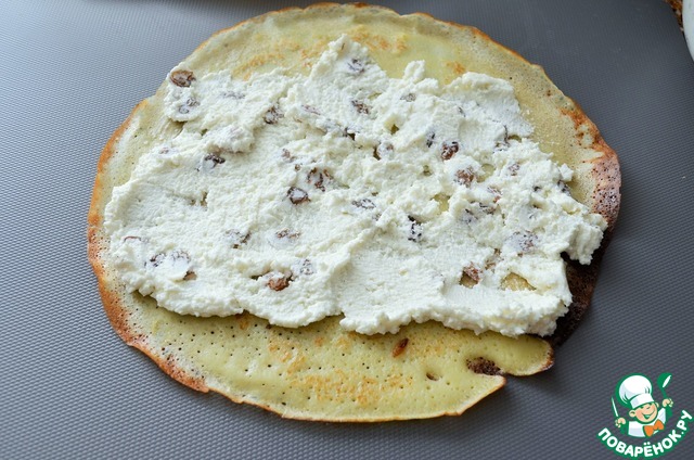 На блинчик выложить 2 ст. л. с горкой творога, распределить.