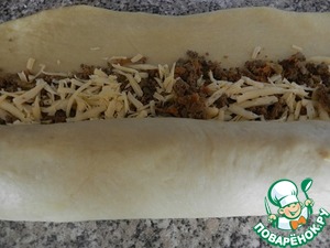 Тесто раскатать в прямоугольный пласт толщиной около 3мм. Выложить печеночную начинку, сверху посыпать тертым сыром. Начинку выложить не до края, оставить где-то 5см, чтобы легче было завернуть рулет.