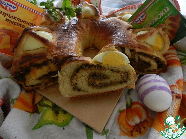 Предлагаю испечь к праздничному столу пасхальный венок с несладкой начинкой в виде куриной печени с луком, морковью и сыром... Верх нашего венка украсим яйцами...