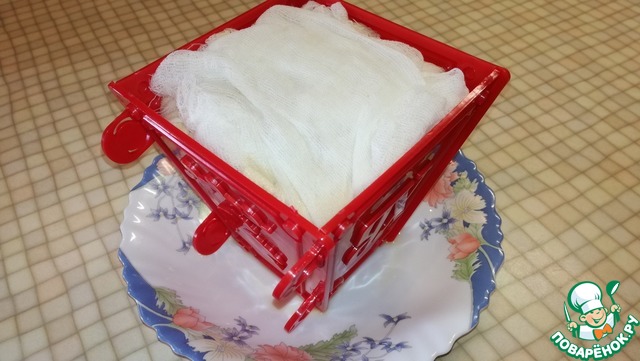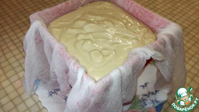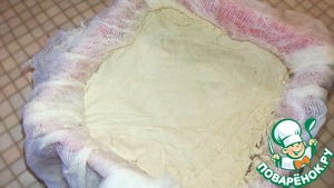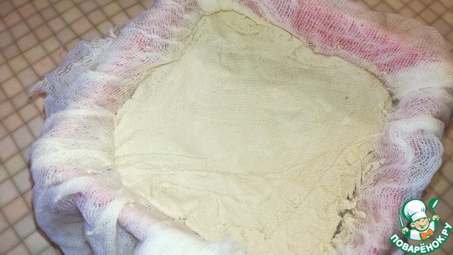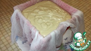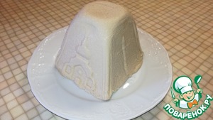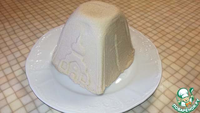 Накрыть концами марли, пасху поместить в глубокую тарелку, сверху поставить груз (баночку с водой и т. д.) и отправить в холодильник на 13 часов. Изредка сливать сыворотку.