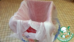 Берём форму для пасхи, у меня 12 см в высоту, длина верхней грани 6 см, нижней 11 см. И застелить марлей в два слоя.