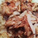 Лук нарезать полу кольцами и обжарить на растительном масле до состояния альденте. Грудку нарезать небольшими кусочками и добавить к луку. Обжаривать на сильном огне при постоянном помешивании минут 5.