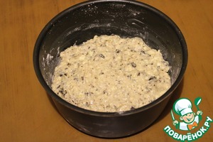Форму диаметром 18 см смазать маслом и присыпать мукой. Выложить тесто. Поставить в разогретую духовку до 180С духовку примерно на 40 минут (до сухой зубочистки)