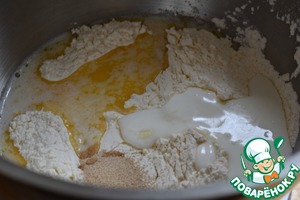 Теплое молоко смешать с натуральным йогуртом и растопленным (но не горячим!) сливочным маслом. Всыпать просеянную муку, сахар, ванильный сахар, соль и дрожжи.